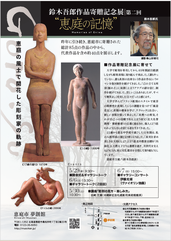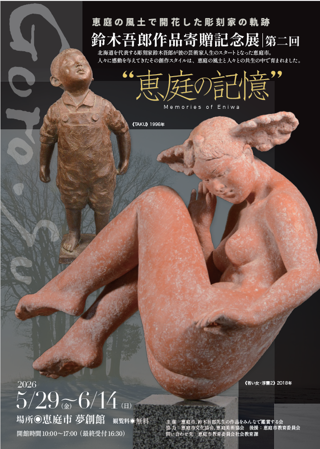 2026年に、恵庭市寄贈祈念展の第二弾を開催いたします。詳細が決まり次第、ご案内いたします。 鈴木吾郎作品寄贈祈念展 日時:2026年5月29日(金)~6月14日(日) 時間:10:00~17:00(最終受付16:30) 場所:夢創館(恵庭市島松仲町1丁目2-20) 恵庭駅前 ●お問合せ先:恵庭市教育委員会社会教育課、鈴木吾郎